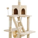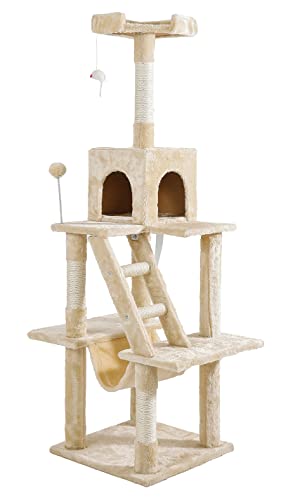 リコメン堂のキャットタワーは、スリムなデザインで多頭飼いに最適です。爪とぎ、隠れ家、展望台、おもちゃ付き。サイズは46cm x 46cm x 153cm、ベージュカラーです。