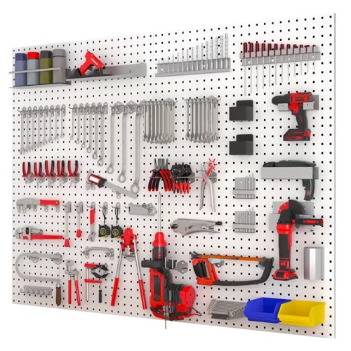 MIMIER ホワイトのスチール製有孔ボードは、450x450mmのサイズで耐荷重70KGです。業務用で高耐荷重、壁掛け可能なツールラックとして、ガレージや工場作業、DIYに最適です。
