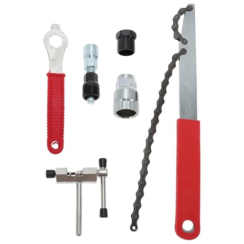 BULLSPANNの6点工具セットは、プロフェッショナル向けの自転車メンテナンス用品です。マウンテンバイク対応のスチール製フライホイールチェーンスプロケットリムーバーを含む、シルバートーンとレッドのスタイリッシュなデザインです。