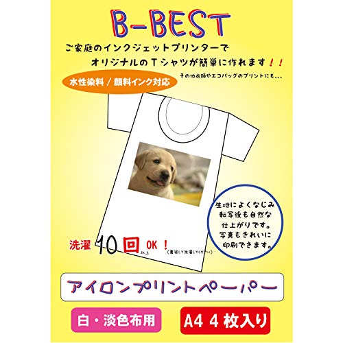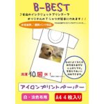B-BESTアイロンプリントシートは、インクジェットプリンタ対応のA4サイズ(白・淡色布用)転写シートです。4枚入りで、オリジナルデザインの衣類や小物に簡単に印刷できます。
