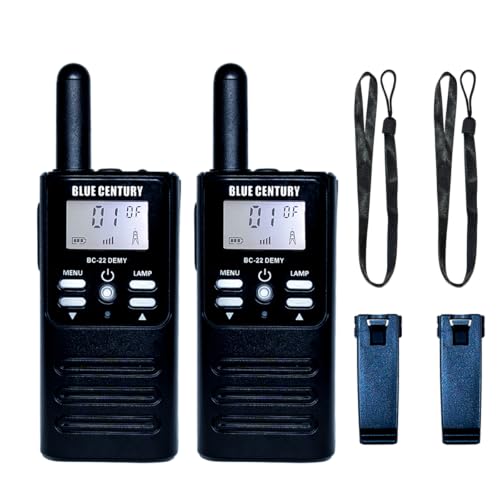BLUE CENTURY BC-22DEMYは、小型の特定小電力トランシーバーで、単三電池2個モデル。ストラップとベルトクリップ付属、総務省技術基準適合品で技適マークあり。本体2台セット。