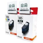 インクカートリッジ BC-385 (ブラック) と BC-386 (カラー) のセット。高品質な印刷が可能で、鮮やかな色合いが特長です。さらに、除菌ミニシート2枚付きで、清潔な環境をサポートします。