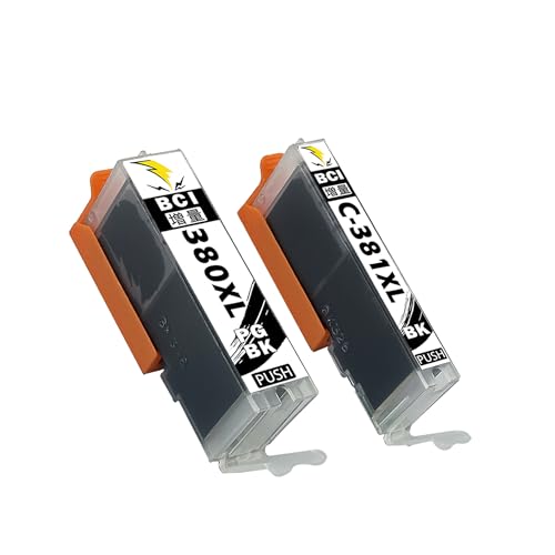 キャノン用BCI-380/381互換インクカートリッジ。ブラック大容量タイプ、残量表示付き。対応プリンター: TS8130/TS8230/TS8330/TR7530/TS8430/TS6330。BCI-380XL(PGBK)×1、BCI-381XL(BK)×1の計2本入り。