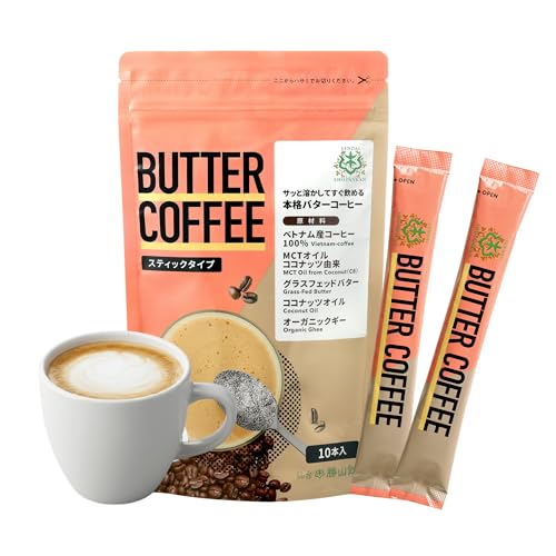 バターコーヒー スティックは仙台勝山館の製品で、個包装が10本入っています。お湯に溶かすだけで手軽に楽しめる、MCTオイルとグラスフェッドバター配合の置き換えダイエットコーヒーです。