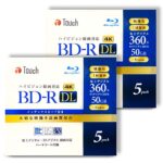 Touch E-セレクトのBD-R DL 50GB 10枚セット(5枚パック×2)は、片面2層構造で4K録画対応、6倍速(1-6倍速)です。大手メーカー同工場製で安心の一年保証付きです。