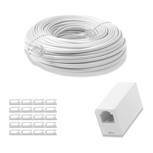 30mの電話機延長ケーブルで、6極4芯のRJ11ストレートタイプです。スリムモジュラーケーブルとして使え、インラインカプラーとケーブルクリップホルダー20個(白)付きの便利なセットです。