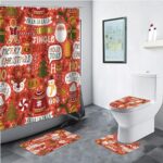 スノーマンとサンタクロースデザインのシャワーカーテンセット。バスマット、便座クッション、滑り止めマット付き。防水加工でクリスマスの雰囲気を演出します。