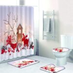 スノーマンとサンタクロースデザインのシャワーカーテンセット。滑り止めマット、防水便座クッション、バスマットが含まれたクリスマス装飾のバスルームセット。