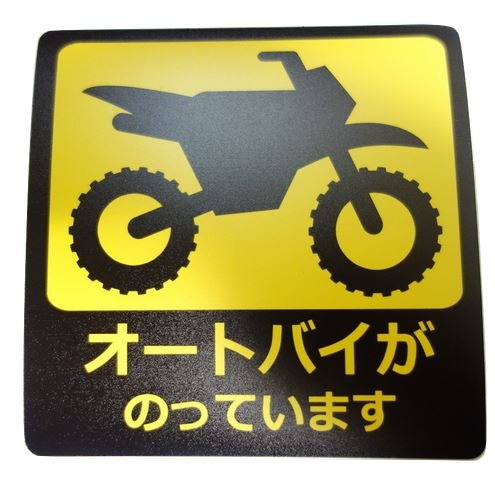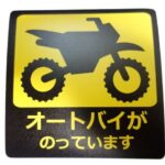 ハイエースやNV350キャラバンに最適な「オートバイがのっています」UVマグネットステッカー。耐候性と耐久性に優れた国産品で、オフロードやモトクロス愛好者におすすめです。安全にバイクを運ぶ際のお洒落な目印に。