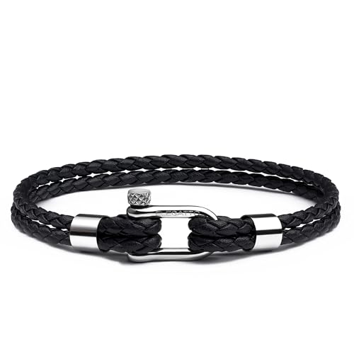 Elegatto Helixのプレミアムヴィンテージレザーブレスレット。ダブルブラックのレザーストランドにスターリングシルバーのポリッシュミニシャックル留め。Mサイズ、宝石なしのメンズデザイナージュエリーです。