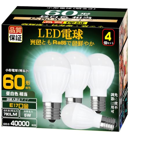 ミニクリプトン型調光器対応LED電球E17、昼白色相当(5W)で60形相当、760ルーメンの広配光タイプ。断熱材施工器具、密閉器具対応の4個セットです。