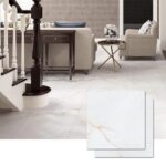 フロアタイルは置くだけで簡単に大理石調の床にリメイクできるシート。108枚入りで約6畳分、クッション性があり、トイレや玄関にも最適。防水仕様のため、張り替えも容易です。