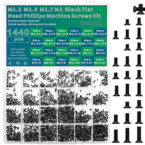 Zmbrollの黒ノートパソコン用ネジキットは、M1.2、M1.4、M1.7、M2サイズを含む1440本の平頭機械ネジ、SSD用部品が揃っており、ミニ機械ネジシリーズとして便利です。