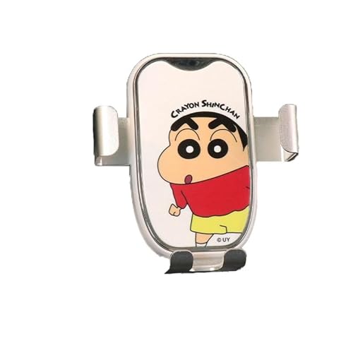クレヨンしんちゃんデザインの車載スマホホルダー。片手操作で簡単取り扱い、重力クリップ式でエアベントに固定。iPhoneやAndroid対応。