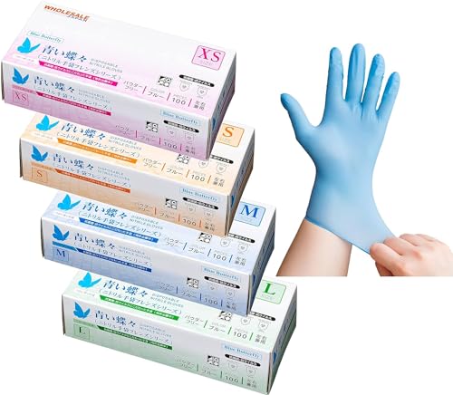 青い蝶々ニトリル手袋は、高品質のニトリル素材で作られており、100枚入のパッケージです。耐油性・耐薬品性に優れ、医療や食品業界、家庭での使用に最適です。手にフィットし、快適な使い心地を提供します。