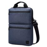 エレコムのパソコンケースは、リサイクル素材を使用した縦型で、取っ手とショルダーベルト付き。撥水加工により水しぶきから保護。14インチPC対応。カラーはネイビー。