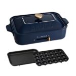 BRUNOのコンパクトホットプレートは、たこ焼きと平面プレートの2種が付属。ネイビー色でおしゃれなデザイン。1200Wの温度調節可能で、1人~3人用に適した小型サイズ。ひとり暮らしやギフトにも最適です。