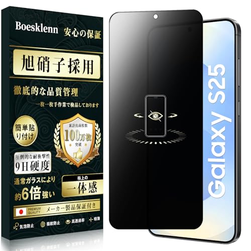 Boesklenn対応のGalaxy S25用フィルムは、旭硝子素材を使用した9H硬度の覗き見防止保護フィルムです。耐衝撃、指紋防止、飛散防止、反射防止機能を備え、撥水撥油性に優れ、簡単に貼り付けられます。
