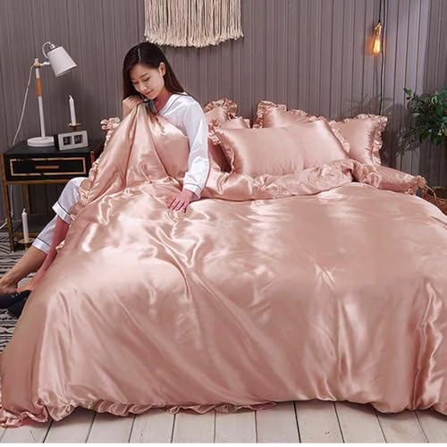 涼感を感じるおしゃれな布団カバーセット。ツルツルのシルク似のサテン素材で、優しい肌触り。ピンク色で可愛いフリル付き。シングル3点セット(掛布団カバー、ボックスシーツ、枕カバー)。丸洗いOK。