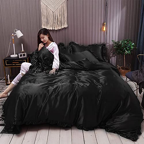 涼感おしゃれな布団カバーセット。シルクのようなサテン素材で、光沢感があり柔らかい肌触り。シングル3点セットで、可愛いフリル付き。丸洗いOK、和式洋式どちらにも対応。
