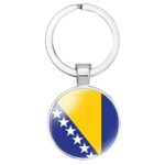 ボスニア・ヘルツェゴビナ国旗のキーチェーン。男性・女性問わず使えるギフトに最適。ステンレススチールと象嵌ガラス素材を使用し、丈夫で美しいデザインが魅力の一品。サイズはワンサイズ。