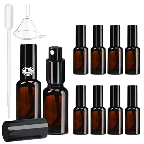 30mlの茶色遮光ガラススプレーボトル10個セット。蓄圧式で極細ミストが出せ、香水・芳香剤・化粧品など多用途に使用可能。旅行や消毒用にも便利な携帯用デザインです。