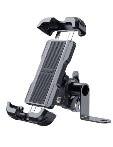 Lamicall バイク用スマホホルダーは、片手操作で360度回転可能。ミラーマウント付きで振動吸収設計、iPhone16/15/14/13/12/11/8 Plus Pro Maxに対応。