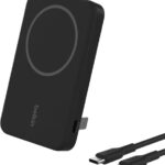 BelkinのQi2対応ワイヤレスモバイルバッテリー(5000mAh)は、iPhoneやAndroidに対応。出力7.5W、パススルー充電、USB-Cケーブル1m付属。キックスタンド付きで持ち運びも便利。