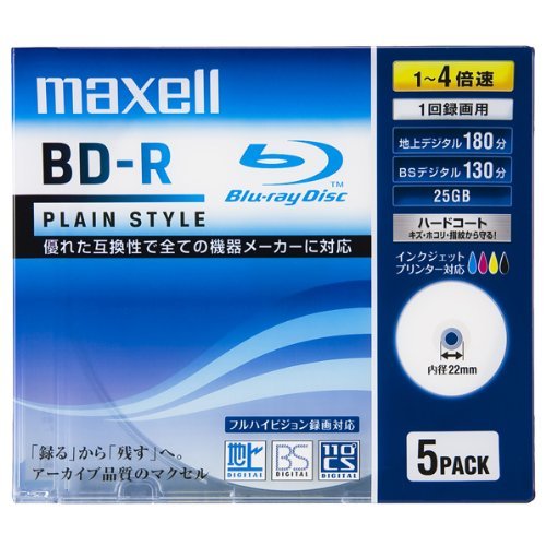 Maxellの録画用BD-R、130分の記録容量を持ち、4倍速対応のPLシリーズ。インクジェットプリンタ対応ホワイト(ワイド印刷)で、5枚が5mmケース入り。