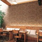壁紙屋本舗ののり付きクロス、レンガ・石目デザインのブラウン赤茶色。巾93cm、m単位で切売可能。防かび加工済みで、リフォームや張り替えに最適。受注生産品のためキャンセル不可。