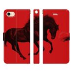 ブレインズのiPhone 16e用手帳型ケース。REAL HORSEデザインのレッドカラーで、競馬や乗馬ファンに最適。カード入れ、ポケット付き、スタンド機能あり。ユニークでカッコいい国産アイフォンケース。