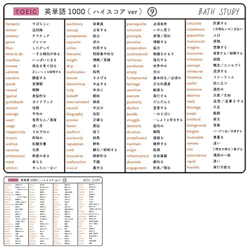 TOEIC対策に最適な「高得点を目指す頻出単語1000語」学習セット。お風呂でも安心の防水シート5枚付きで、効率的に語彙を増やし、ハイスコアを目指しましょう!