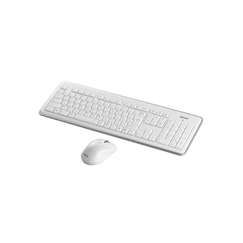 iBUFFALOの無線キーボード・マウスセットは、2.4GHzの無線接続を備え、パンタグラフ式キーとホワイトカラーのデザインが特徴です。快適なタイピングとスムーズな操作を提供します。