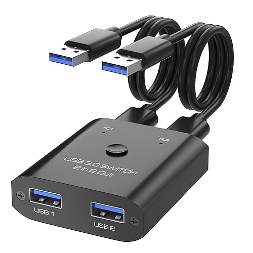 USB3.0切替器は2台のPCを接続し、高速転送を実現。最大5Gbpsのデータ転送速度を誇り、手動または自動切替機能を搭載。複数のデバイスを簡単に共有可能。