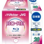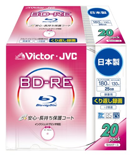 Victorのくり返し録画用ブルーレイディスク(25GB、2倍速)は、ハードコートで保護されています。ワイドホワイトプリンタブル仕様で、20枚入り。日本製です。