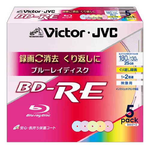 ビクターの映像用ブルーレイディスクは、くり返し録画用で25GBの容量を持ち、2倍速の書き込みが可能。ハードコートの保護により耐久性があり、ワイドカラープリンタブルデザイン。5枚入りで台湾製です。