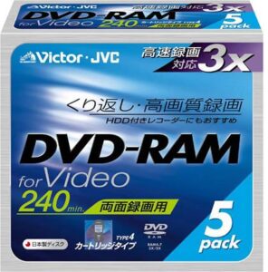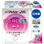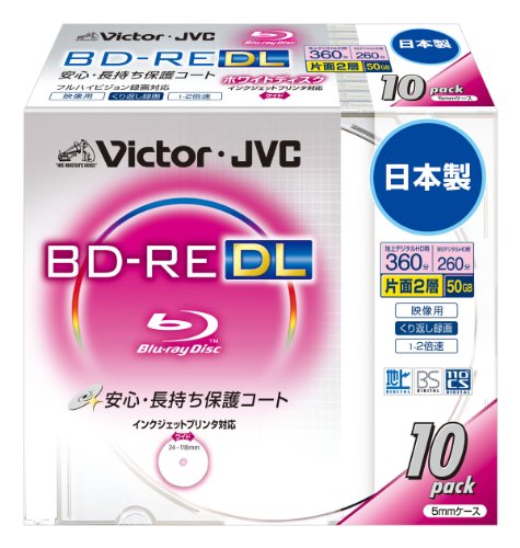Victorの映像用ブルーレイディスクは、くり返し録画可能な片面2層50GB、2倍速です。ハードコート保護で傷に強く、ワイドホワイトプリンタブル仕様の10枚入り、日本製です。
