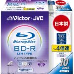 Victorの映像用ブルーレイディスクLTHタイプは、1回録画用で130分の収録が可能。25GBの容量と4倍速の書き込み速度を持ち、ホワイトプリンタブル仕様で10枚入りです。