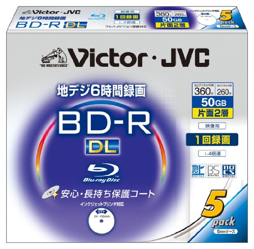 ビクターの日本製映像用ブルーレイディスクは、1回録画用で片面2層、容量50GBのディスクです。4倍速対応、ハードコート仕上げ、ワイドホワイトプリンタブルで、5枚パックで販売されています。