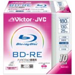 Victorの映像用ブルーレイディスクは、くり返し録画が可能な130分、25GBの容量で2倍速対応。ホワイトプリンタブル仕様で、日本製の10枚セットです。