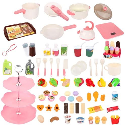 Phantasmiaのプレイフードセットは、98点のキッズキッチンおもちゃで、フルーツや野菜、デザートが含まれています。子供用の安全なプラスチック製品で、家庭内での楽しい室内遊びに最適です。