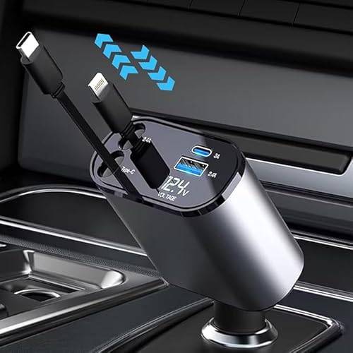 4in1巻き取り式カー充電器。4台同時充電可能で、Type-C 100W、Lightning 20W急速充電対応。DC12/24V車に対応し、電圧計も搭載。iPhone 16/15/14/13/12、Galaxy S22/S21 Ultra、Xperia、iPad、AQUOSなどに対応。