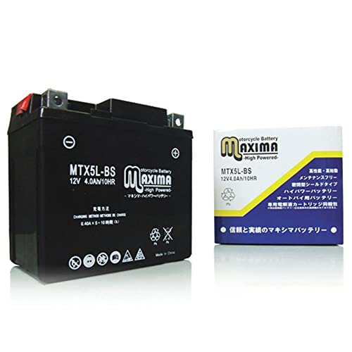 マキシマバッテリー MTX5L-BSはロードサービス付きのシールド式バイク用バッテリーです。液入れ充電済みで、アドレスV100やバーディ80などに対応。4cycleエンジン用の信頼性の高い選択肢です。