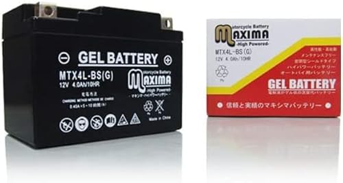 マキシマバッテリー MTX4L-BSは、シールド式の充電済みジェルタイプバイクバッテリーです。ロードサービス付きで、バーディー80やRC50に適合します。サイズ感も良好で耐久性に優れています。