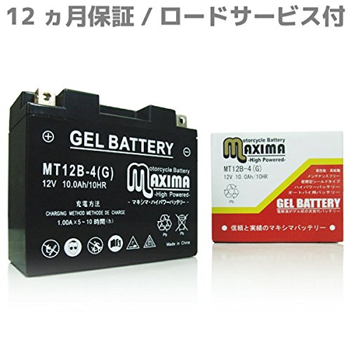 マキシマバッテリー MT12B-4はシールド式のジェルタイプで、12V 12Ahのバイク用バッテリーです。充電済みでロードサービス付き、互換品はYT12B-BS/GT12B-4/FT12B-4です。