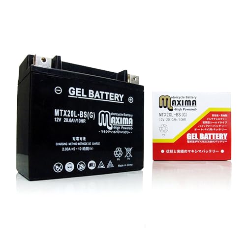 マキシマバッテリー MTX20L-BSは、シールド式のジェルタイプで、充電済み。バイク用で、互換モデルはYTX20L-BSや65989-90B、65989-97A/-97B/-97Cです。ロードサービス付き。