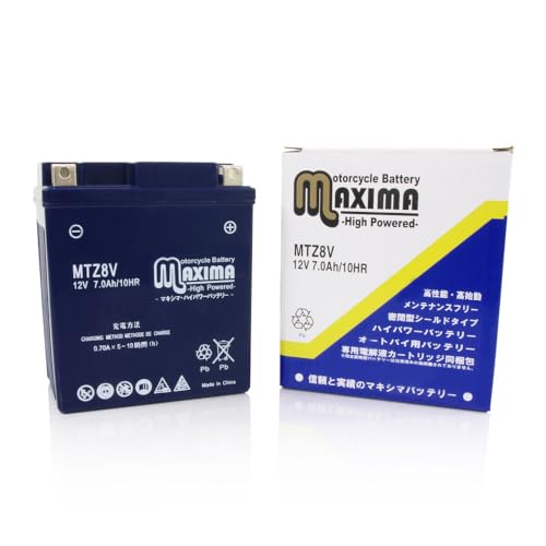 マキシマバッテリー MTZ8V はシールド式で、液入れ充電済み。バイク用で、CRF250ラリーやCRF250Lなどに対応。ロードサービス付きで安心。