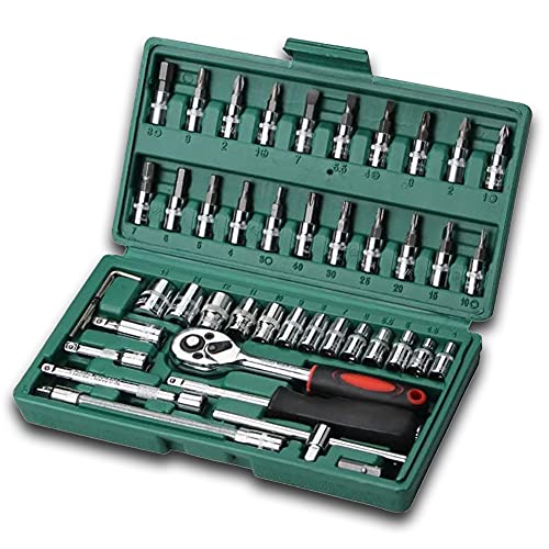 Thecomの46点ソケットレンチセットは、1/4インチ差込角で車やバイクのDIY作業に最適。専用収納ケース付きで、スリーブやラチェットレンチが含まれ、グリーンのデザインが魅力。