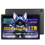 10インチWi-Fiタブレット、Android 15、20GB+64GB(1TB拡張可)、1280*800解像度、8コアCPU、顔認証、5MP+8MPカメラ、Wi-Fi 6、Widevine L1、無線投影、薄型軽量、GMS認証、ケース付き。