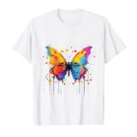 レインボー ペイント スプラッシュの蝶と花がデザインされたTシャツ。カラフルで華やかな印象を与え、個性を引き立てます。快適な着心地で、カジュアルなコーディネートに最適です。